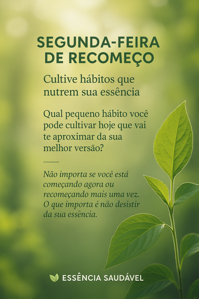 Aqui na Essência Saudável, acreditamos que o verdadeiro progresso está nos pequenos passos consistentes. Não é sobre mudar tudo de uma vez, mas sim sobre plantar sementes todos os dias — um copo de água logo ao acordar, um alongamento consciente, uma escolha mais natural no prato, cinco minutos de silêncio para escutar a si mesmo.
